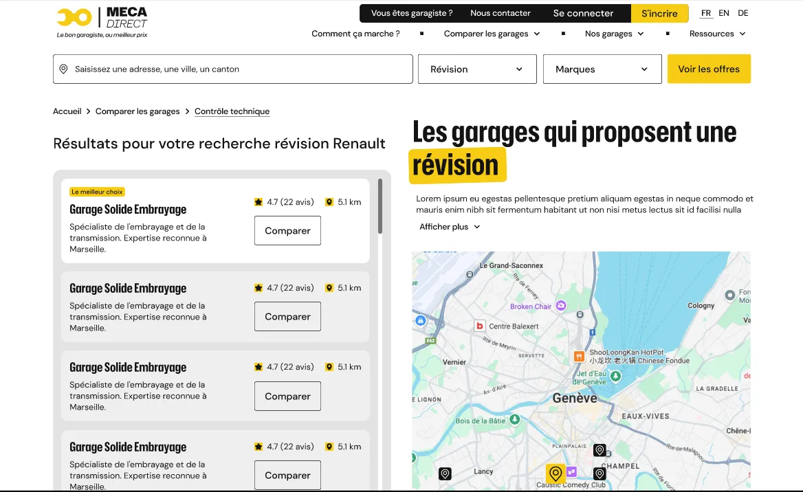 Vous cliquez sur “obtenir un devis” ou vous vous rendez sur cette page pour obtenir un devis pour votre véhicule. La demande sera envoyée aux garages dans le périmètre sélectionné et vous recevrez des propositions dans les heures suivantes.